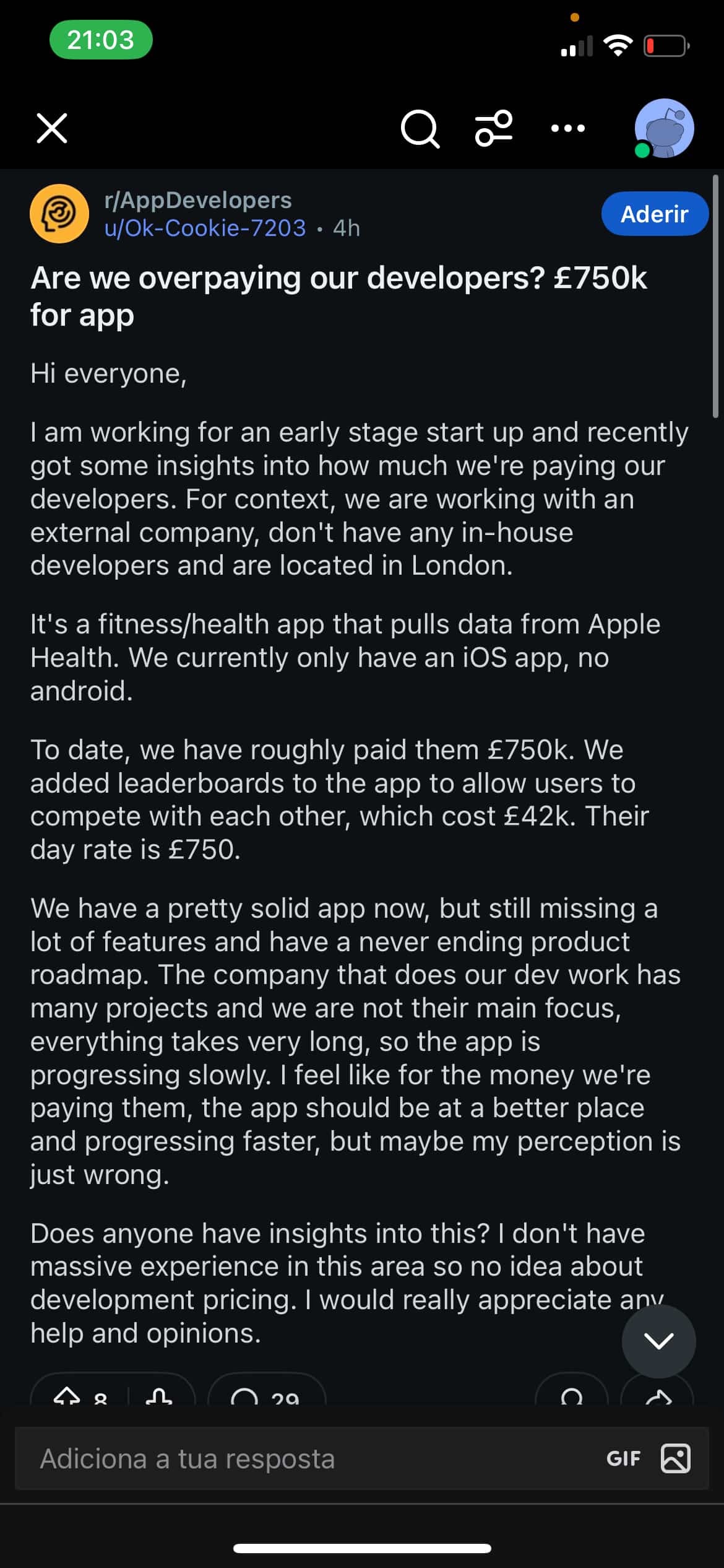 But the opposite can also happen. Paying premium rates doesn’t always guarantee premium results. Just recently, a founder on Reddit shared how their startup spent £750k on a fitness/health app, only to feel frustrated with slow progress and missing features.